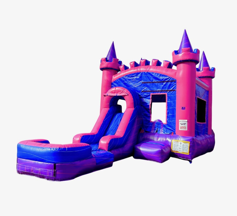 Bring fairy-tale fun to your next party with the Combo Bounce House. This princess combo bounce house shines in bright pink with purple and blue accents. It offers a roomy 13 by 13 jumping zone plus a slip-and-slide extension. The full unit spans 25ft long and can be used wet or dry — available at different rates, so please inquire. Perfect for birthday parties, family events, and backyard celebrations. 💖🛝